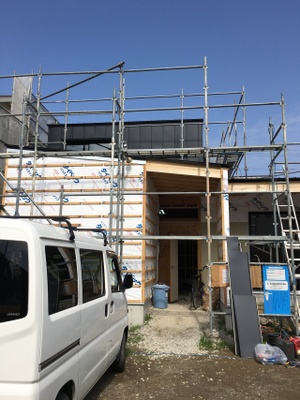 外部では、2階建て部分の外壁ガルバリウム張りが進行中!