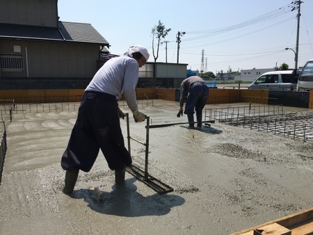 その後を、大まかに均し、タッピングしてコテで押さえていく職人さんが2人