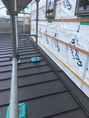 外部は屋根も葺き終わり、胴縁まで施工されています。