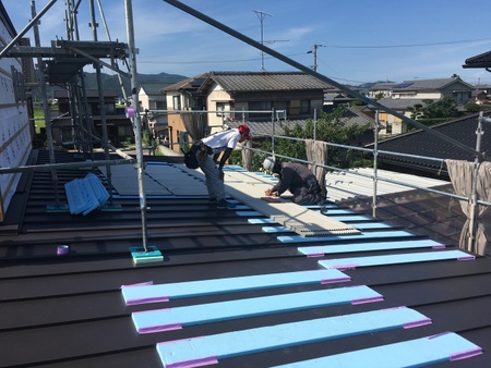 下屋を養生し、その上に外壁の仕上材であるガルバリウム鋼板小波を広げ