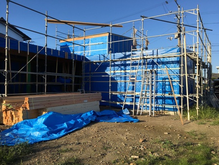 囲っていく順番や重ねる位置、雨水の流れを考えてブルーシートを張り