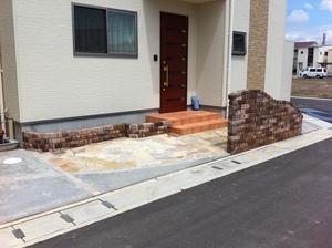 自然石、東洋エクステリアのレンガを用いた花壇、門壁など。