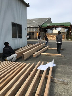 くもり空の下、あらわし(化粧材)となる梁・登り梁・たるきのあてこみ作業です。