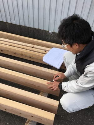 材の色味、木目、節の状態、元先を見極め、どのように配置するか決めていきます。