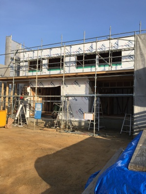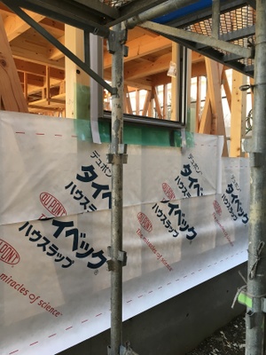 作業が進み、全体が透湿・防水シートで囲われました。